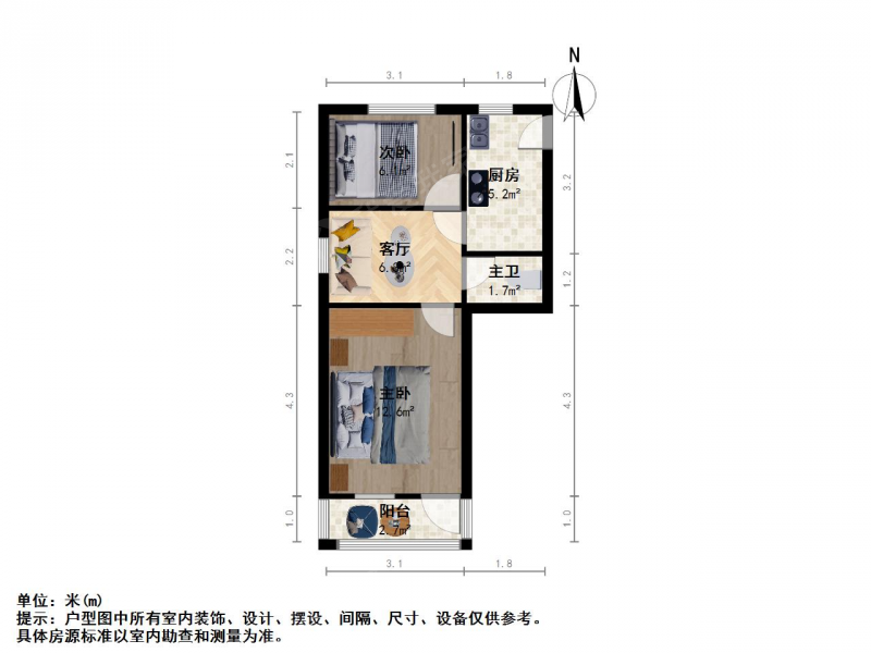 2室1厅1卫 58㎡