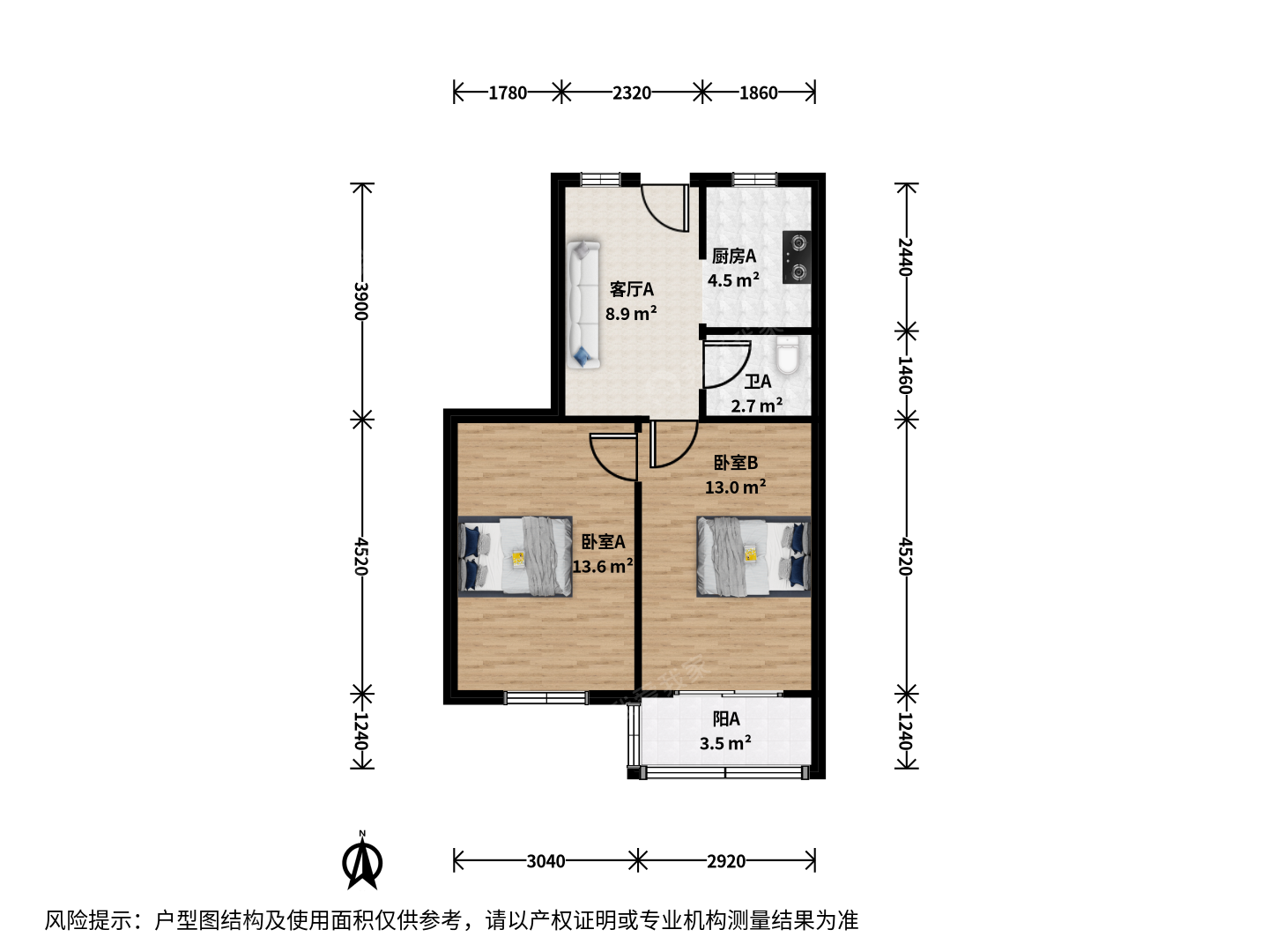 2室2厅2卫 62㎡